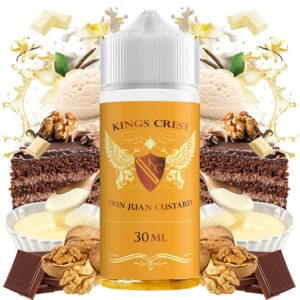 El aroma Don Juan Custard en formato Longfill de Kings Crest sorprende por su sabor a tarta de chocolate cubierta con mantequilla de nueces pecanas, crema batida y además, ¡con un toque de natilla casera! Una combinación irresistible en tu paladar.
